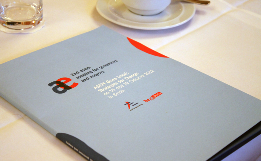 Die Farben Blau und Rot charakterisieren Asien, Europa und Berlin. Als Referenz zur Gastgeberstadt verwenden wir als Hausschrift die Berliner Grotesk. Der besondere Charakter der Konferenz wird durch die Verwendung von hochwertigem Papier aus der Munken Serie repäsentiert.